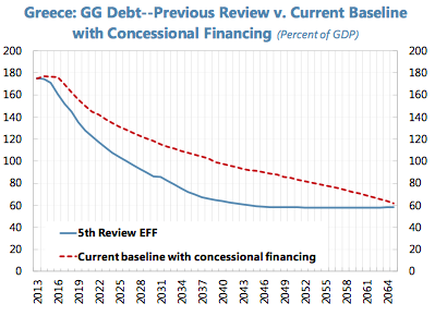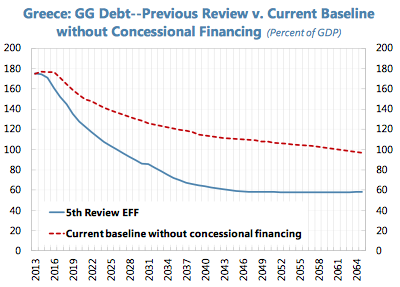 The IMF notes that Greece will not be able to close the gaps in its financing from the world's debt markets on terms that are consistent with debt sustainability. As such, euro area member states will have to step in with at least €36 billion of concessional financing to cover the nation's financing needs from now until the end of 2018. Even with that financing, the debt-to-GDP is projected at 150 percent in 2020 and 140 percent in 2022 as shown in blue on these two graphics which compare the debt-to-GDP levels with and without concessional financing from the euro area: