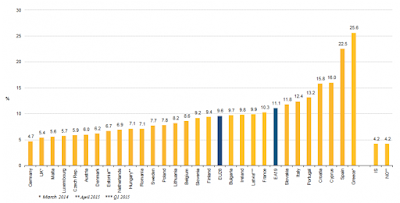 It was also expected that Greece's unemployment rate would reach the same low levels as are found in Germany, another wildly optimistic projection. Here is the latest unemployment data for the euro area showing that Greece's unemployment rate is over five times higher than Germany's: