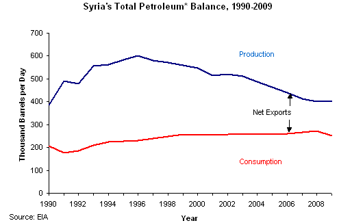 According to the Energy Information Administration (EIA), Syria produced around 400,000 BOPD of combined oil and natural gas liquids in 2009 and 213 BCF of natural gas in 2008. Syria’s oil production had been in a state of decline for a decade and a half since peaking at 583,000 BOPD back in 1996. Recent successful development drilling, new discoveries and field rehabilitation are expected to increase production capability and put a halt to production declines. Over the past 2 years alone, an additional 50,000 BOPD of productive capability has been added and in 2010, an additional 15,000 to 20,000 BOPD was expected to come on stream from new discoveries by Indian and Russian oil companies. According to the Organization of Arab Petroleum Exporting Countries (OAPEC), Syria has 3 billion barrels of oil reserves (0.26 percent of the world’s total and 0.46 percent of OAPEC’s total).