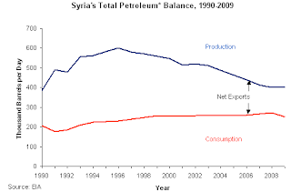 For the past 2 decades or more, Syria has consumed less oil than it has produced. Domestic consumption has risen slowly over the past 2 decades from 200,000 BOPD to 263,000 BOPD in 2006 and 308,000 BOPD in 2010 according to OPEC statistics. As shown in this chart, Syria has exported up to 400,000 BOPD back in 1996; this has declined to 149,000 BOPD in 2010, again according to OPEC: