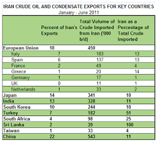 Iran’s largest volume of exported oil is comprised mainly of Iranian Heavy Crude. In 2010, Iran’s net oil export revenues were approximately $73 billion, providing roughly half of Iran’s government revenues. For the first half of 2011, China, India, South Korea and Turkey have all increased their imports of Iranian crude as export volumes are reallocated to countries that have less stringent sanctions in place. Here is a chart showing how export levels by country have changed (increased for Asia (excluding Japan) and decreased for Italy) for the first half of 2011 as compared to 2010 above: