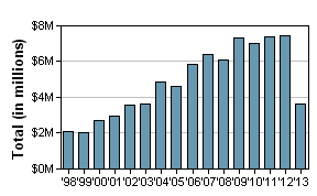 In 2012, Raytheon spend $7.45 million on lobbying, putting them in 54th place out of 4374 lobbyists. As you can see on this bar graph, that's about on par from the totals spent in the period from 2009 to 2011 but up from the earlier part of the new millennium: