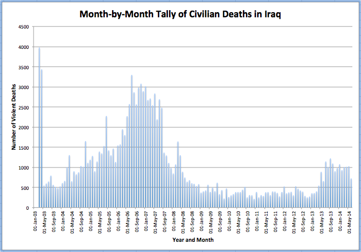 An interesting and sobering website, Iraqi Body Count, does a day-by-day count of Iraqis killed, where they were killed and how they were killed. Their data is drawn from media reports, hospital and morgue data and information from NGOs. Between June 1 and June 12, 2014, 701 Iraqi civilians were killed, bringing the documented civilian death count to between 124,573 and 138,882.