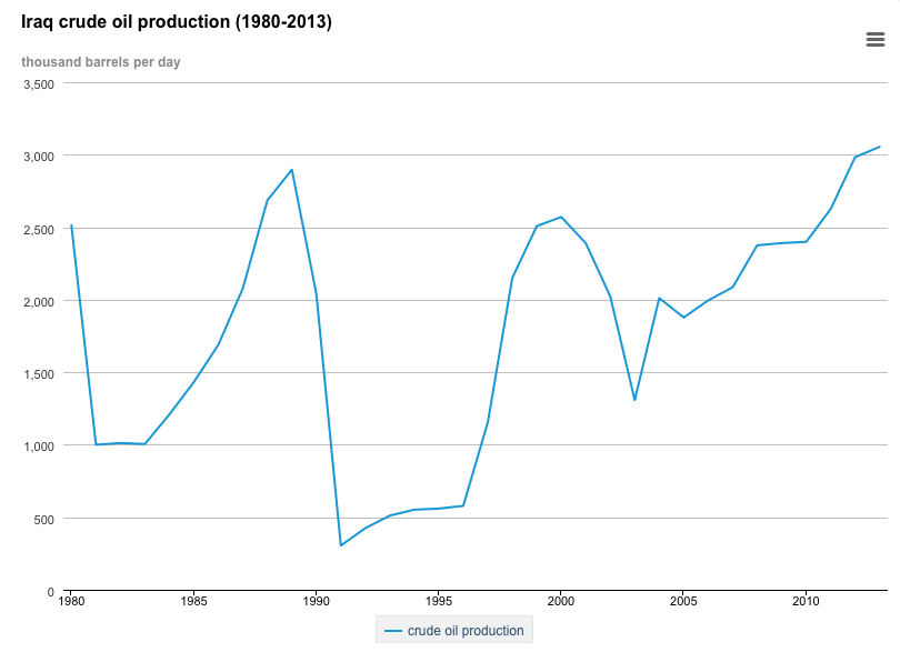 Here is a graph showing daily oil production in Iraq since 1980 (in thousands of barrels per day):