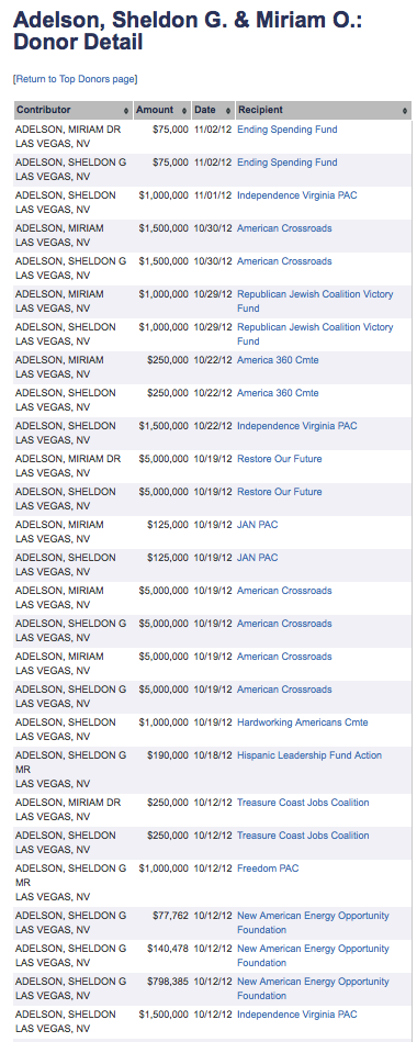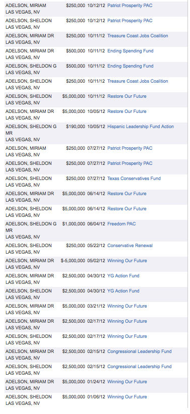Two names that are missing from this list are Sheldon and Miriam Adelson of Las Vegas, Nevada. Here is a chart showing their political contributions during the 2012 cycle: