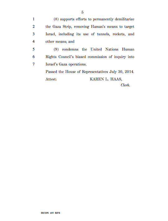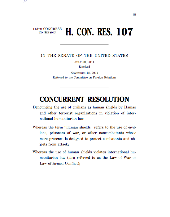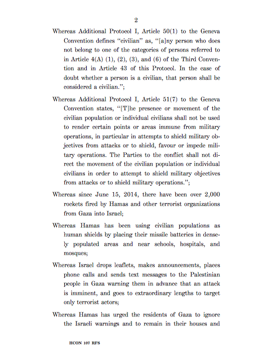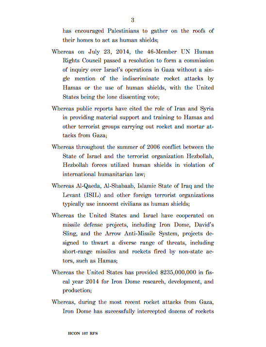Just for fun, here is a complete copy of H. Con. Res. 107 that condemns the use of civilians as human shields by Hamas so you can get a sense of the power of the lobby:
