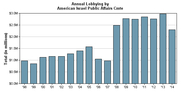 So far in 2014, AIPAC has spent $2.295 million on getting decision makers in Washington to enact policies from a pro-Israeli perspective.