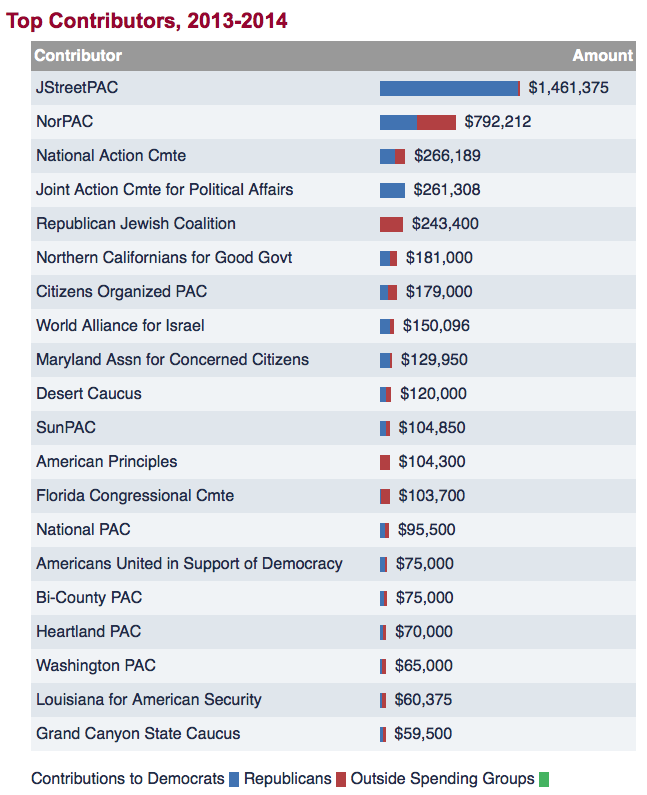Here are the top pro-Israel political contributors for the 2013 – 2014 cycle: