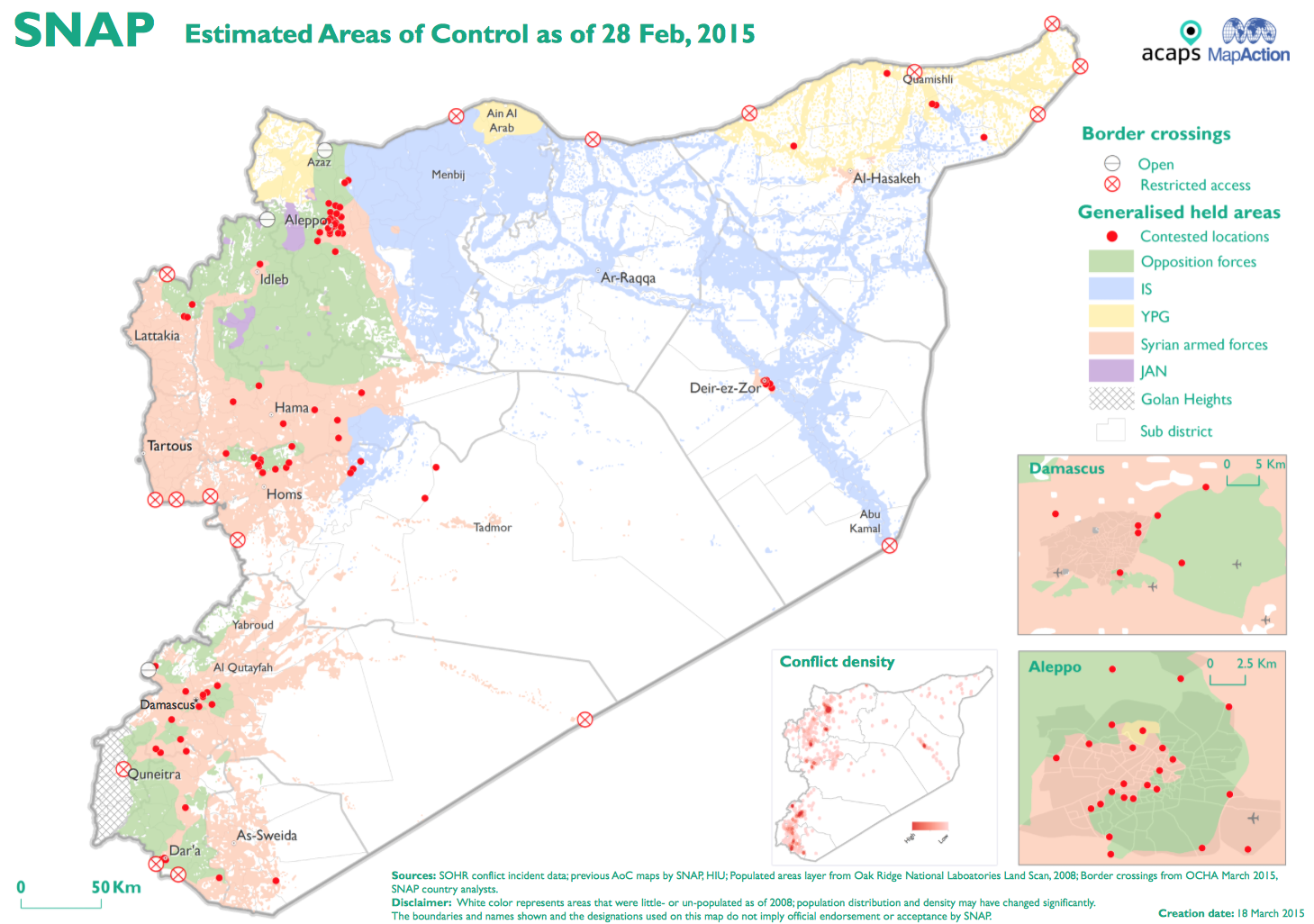 Syria's civil war began in the spring of 2011, a result of the region's Arab Spring protests. Opposition to President Bashar al-Assad's iron grip on Syria began with nationwide protests that were met with violent responses from Assad's forces. As the conflict/civil war has proceeded, Syria's government has lost control of significant portions of the country and, as shown onthis map from Strategic Needs Analysis Project, currently controls a very small part of the nation: