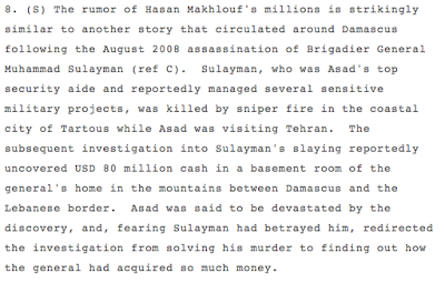 At the time of the assassination, an investigation revealed that Suleiman had $80 million in cash in a basement room in his home in the mountains between Damascus and the Lebanese border as shown on this secret cable released by Wikileaks: