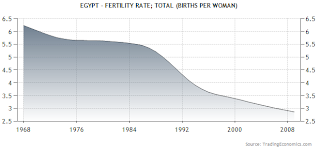 This rising birthrate is creating (and will continue to create) rising stress in the country’s employment picture. Here is a population pyramid for Egypt for the years 1986, 1996 and 2006 showing a rapidly growing population in the 1980s. It is these young people that are now forming the “unemployed cohort” as many of them have already reached (or will soon reach) their working years: