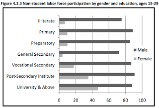 Here’s a graph showing how labour force participation for non-student youth between the ages of 15 and 29 varies by educational level and gender from the Population Council Survey of Young People in Egypt:
