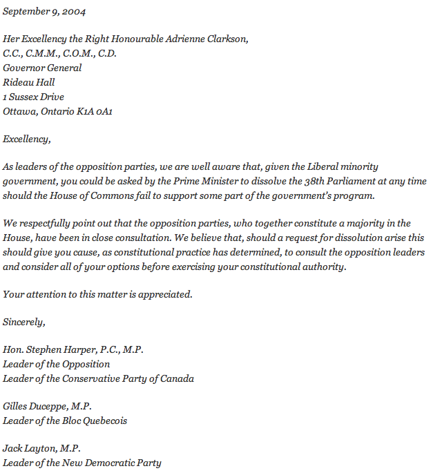 1. Read the letter! First, there’s no mention of the word “cooperation” but rather “consultation”. Second, rather than seeking to overthrow the government, the letter is simply seeking a voice by the opposition parties in the possibility of a dissolution decision by the Governor General. How different from the blatant agreement of coalition between the NDP, Bloch, and Liberals in an attempt to grasp control of the government.