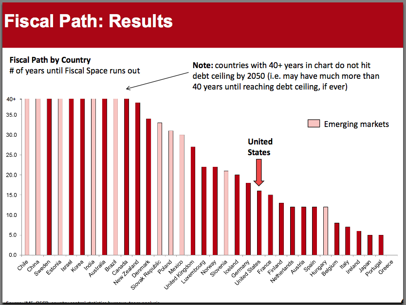 Let’s deal with fiscal space first. Fiscal space is basically answering the question "how much debt is too much?". It represents the amount of additional debt that a given nation can issue before the level of debt creates a crisis, in other words, the difference between the current debt and the debt crisis level which is termed the "debt ceiling". The concept of fiscal space is an estimate rather than a hard number since each nation’s economy has varied ability to sustain high levels of debt. The researchers used a term "weighted-average debt level" which consists of gross sovereign debt, intra-governmental debt holdings such as social security, sub-national government debt and public debt held by foreigners to level the playing field between nations so they could get a more complete look at the total amount of a country’s debt. Their overall analysis of the nations in the study show that nations should maintain a space of at least 50 percent of GDP between their debt level and their debt ceiling to reduce the risk of a fiscal crisis. Nations such as Japan, Ireland, Portugal and Greece all have current fiscal space that is less than 50 percent of GDP.