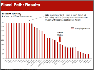 Fiscal path is simply a projection of future levels of sovereign debt for a given nation. Nations with relatively low overall debt today but rapidly rising debt levels may be on a poorer future footing than countries that have high but very slowly rising debt. By using projections for future government spending from the IMF, the study projects sovereign debt for each year into the future up to the year 2050 and then estimates how many years it will be before a country reaches its debt ceiling.
