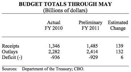 In closing, I’d like to take a brief look at one issue that was not covered by Mr. Makin. According to the latest monthly data release from the Congressional Budget Office on June 7th, the budget totals through to the end of May 2011 look like this: