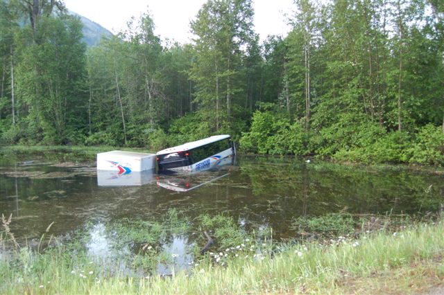 The Clearwater RCMP received the report of the collision at around 4:30 a.m. Wednesday June 22, 2011. RCMP, BC Ambulance and the Clearwater Highway Rescue team attended to the scene approximately 25 km south of Clearwater. The greyhound bus was southbound on Hwy 5 with with 18 passengers plus driver ended up off the highway left side and into a swamp, when the bus encountered a moose crossing the highway. The bus remained upright in about 5 ft of water, with all occupants making it off the bus safely to await emergency crews. One passenger suffered a fractured limb and transported to the Clearwater hospital via ambulance. All others were shuttled via a second bus to the Clearwater hospital to be cleared medically. The highway was closed temporarily, for short period and is now fully re-opened.