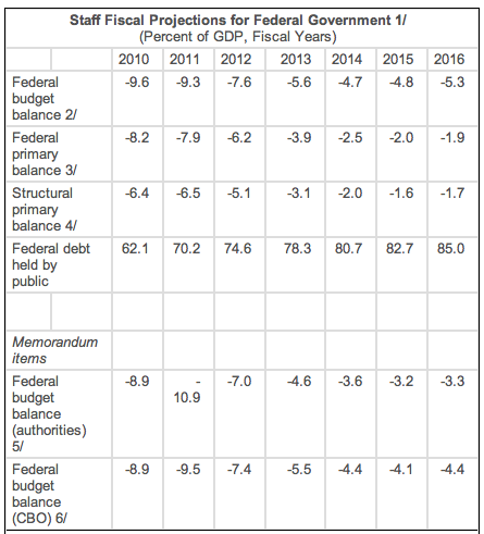 The IMF would like to see the United States reduce its structural deficit at a uniform pace of 1.5 percentage points of GDP per year over the next five years until 2016 from 9.6 percent of GDP in 2010 to 4.7 percent of GDP by 2014. This would at least stabilize the debt-to-GDP ratio at around 85 percent of GDP as shown in this chart: