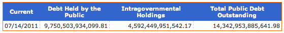 Let me type that out: that’s $14,342,953,885,641.98. I find it fascinating how there are 14 digits ahead of the decimal point but that the Treasury still knows (or at least thinks that it knows) that they have to tack 98 cents onto the $14.3 trillion figure to maintain complete accuracy. I guess a bean counter somewhere is trying their best to keep the ledger balanced.