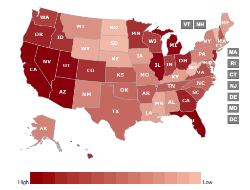 The researchers then looked at the geographic distribution of the foreclosures in the early stage of the Great Recession. In general, the areas with the greatest price appreciation between 2000 and 2007 (think bubble) were in Florida and the Southwest and Northeast states. Now let’s look at a map that shows the concentration of foreclosures by state for the third quarter of 2008: