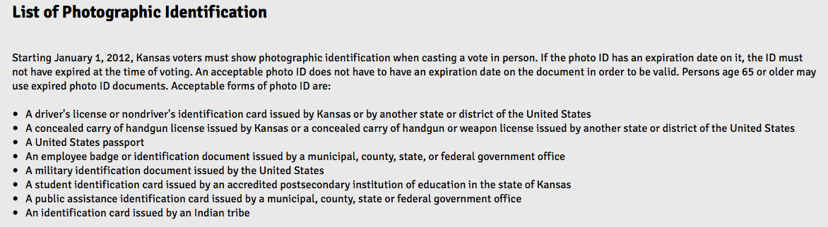 3.) Kansas – In 2012, laws were changed requiring photo ID to vote. In 2016, laws were changed; documentary proof of citizenship is now required to register using the state registration form. Here is a list of acceptable photo identification: