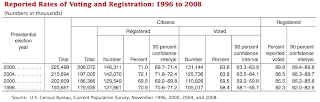 Let’s open by looking at how many votes were cast three years ago. In the 2008 election, there were a total of 131,257,328 votes cast; 59,934,814 (or 45.66 percent of the popular vote) for the Republicans who had selected John McCain as their candidate and 69,456,897 (or 52.92 percent of the popular vote) for Barak Obama. Ralph Nader followed in distant third place with 738,475 votes (or 0.56 percent of the popular vote). Let’s put these numbers into perspective. The Census Bureaureports that in 2008, there were 206.072 million American citizens aged 18 years and older. Of these, 146.311 million were registered to vote in 2008 representing 71 percent of all potential voting-age Americans. This is a decrease in registration of 1 percentage point from the 2004 election; of these registered voters, 89.6 percent actually voted in 2008. When the ballots were all counted, 63.6 percent of all voting-age citizens took the time to cast a ballot, roughly the same percentage as in 2004 as shown on this chart: