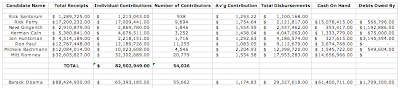 There is no doubt that it takes an unrealistically massive fundraising effort for campaign teams to get their Presidential candidate elected. What these statistics show is that there is an infinitisimally small proportion of Americans who vote with their wallets; just under one percent in the case of the Democrats and well under half a percent in the case of the Republicans in 2008. From the average size of the declared donations, it appears that only a certain select wealthy demographic can afford to make significant and meaningful political contributions to support the candidate of their choice. While campaigns like the small "mom and pop" donations, they LOVE the big donations. It’s even more surprising to see that, despite the growing left-right chasm in American politics, such a tiny number of Americans support their political choice with a cash contribution. Maybe that’s the one percent (or less) that the OWS demonstrators should be focusing on. After all, you can’t run a campaign on hot air alone although you’d never know it! As well, when Main Street Americans sees the massive expenditures necessary to win the ultimate political prize in America, it should become quite apparent just how out of touch America’s politicians have become. After all, not many ordinary Americans have first hand experience with seven, eight or nine figure numbers with a dollar sign in front of them, let alone when the money involved is voluntarily donated.
