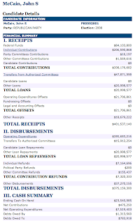 Let’s zoom in on the two final Presidential candidates, John McCain and Barak Obama. Here is more detail showing what John McCain’s team raised, spent and had left over after the 2008 election: