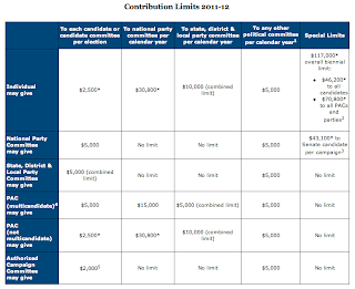 Notice that, while 32 percent of the donations made by individuals were under $200, just over 31 percent of all Presidential Campaign donations were $2000 and larger. In case you weren’t aware, under the United States Federal Campaign Finance Law, the limit that individuals may contribute to a candidate or candidate committee per election is now $2500 (it was $2300 in 2008) but that, should you happen to have $30,800 lying around doing nothing, you would still be within the law if you donated that amount to a national party committee once every calendar year! Here is a chart from the FEC website showing how the contribution limits vary according to the ultimate destination: