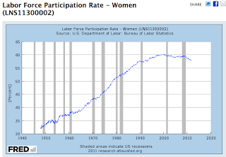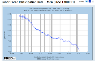In conclusion, in spite of recent improvements in jobless claims and unemployment statistics, this study shows that the recovery has not treated all members of American society equally. Employment growth has been concentrated in jobs where more highly educated workers are required. As well, men are more likely to take jobs that they may not feel are suitable (i.e. don’t pay as well) over the longer term because they are often more attached to the workforce than women; this has improved the job situation for the hairier gender at the expense of women. Older workers have also been net beneficiaries of the "recovery" as the work force shifts toward older workers. From this data, it is apparent that the current sluggish recovery in America’s job market is not related to a mismatch between workers and jobs. Rather, the demand for the most sought-after workers has simply not kept pace with growth in the size of the overall population. In closing, these two graphs showing the declining labor force participation rate since the 1940s for both men and the more recent decline for women pretty much explains why the American employment issue is stubbornly intransigent and on trend with past economic behaviour: