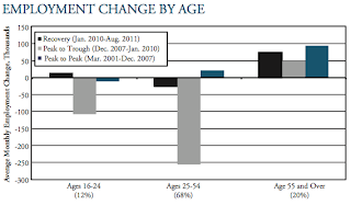 During the Great Contraction from December 2007 to January 2010, the American economy lost 7.8 million jobs; on the flip side, employment of workers aged 16 and older increased by a very paltry 1.1 million over the 19 month period from January 2010 to August 2011. This employment gain data can be broken down further by gender, age and by level of educational attainment as shown in this table: