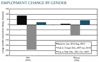 During the down side of the cycle, between December 2007 and January 2010, men saw their employment prospects decline by 242,000 per month (grey bars) in contrast to women that saw their prospects decline by "only" 106,000 per month.