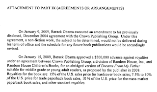 In a quick look through President Obama’s Disclosure for 2009, the royalty income from each of his two books ranged from $1,000,000 to $5,000,000, the same as in 2008 and slightly more than in 2010. We have no way of knowing the exact amounts, however, it is interesting to see that the royalties remained in the same range in the first year of the Great Recession when consumers were cutting back as they did in the prior year.