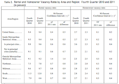 Homeowner vacancy was as low as 1.8 percent in early 2005; this rose to a peak of 2.9 percent in early 2008 and has dropped to 2.3 percent in the fourth quarter of 2011. In the fourth quarter, homeowner vacancy rates were as high as 2.5 percent in the mid-west and 2.4 percent in the south down to 2.0 percent in the northeast as shown on this chart: