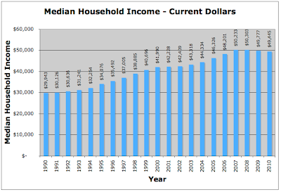 Let’s open by looking at a graph of data that I gleaned from the U.S. Census Bureau website showing the median household income for American families from 1990 to 2010: