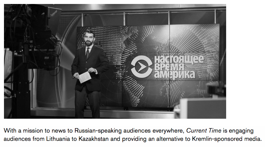 2.) through the February 2017 launching of Current Time, a Russian-language news network that aims to counter Russian false news and misinformation throughout Europe and in Russia as shown here: