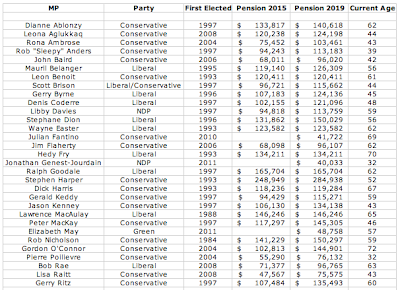 Note that the 2015 and 2019 pension benefits assume that the MP will serve until either 2015 or 2019. The minimum of six years of service means that first term MPs like Elizabeth May will not qualify for their pension until she has put in six years of service in 2017, thus, the data field for her is blank in 2015. I do find it rather appalling that after serving only six years, a very young backbench hair-comber like Mr. Genest-Jourdain can collect $40,033 annually for the rest of his life after he reaches age 55.