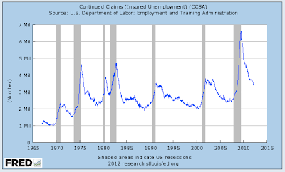 Nearly 1 million more Americans are unemployed as measured by continued claims than were unemployed during the economic "good times" prior to the Great Recession. As well, the number of long-term unemployed is well above levels that would normally be experienced nearly three years after the end of a recession as shown here: