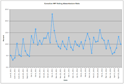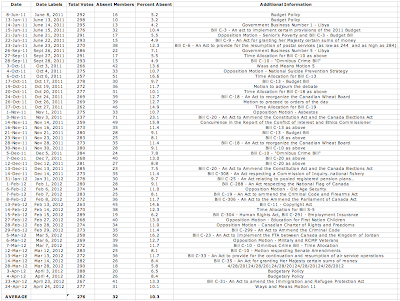 You will notice that I have also included a column that lists the Bills, Motions or Government business that was being voted on. It is really surprising to see when Members are absent; Bill C-18 (the Wheat Board Act), Bill C-6 (the back-to-work legislation for Canada's Post Office) are two bills that were particularly hard-hit with Bill C-6 seeing absenteeism as high as 20.8 percent on June 23rd, 2011. Even the recent back-to-work legislation for Air Canada on March 13th, 2012 saw 36 MPs absent (11.7 percent). Despite Minister Lisa Raitt's assertion that continued service from Air Canada was critical to prevent the collapse of the Canadian economy, only 155 out of 165 Conservatives bothered to show up to vote on the all important legislation that was going to prevent Canada from slipping into another recession.