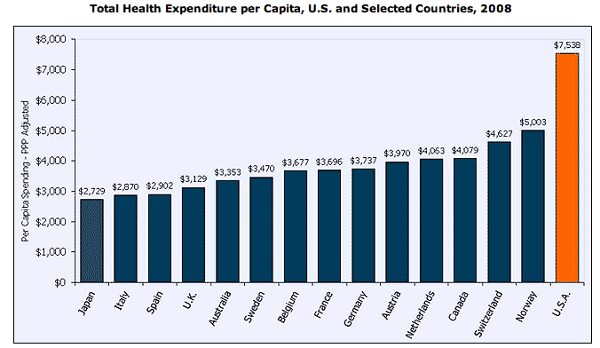 Here is a graph showing the public and private health care expenditures for all OECD nations, once again showing that the United States is by far the largest spender: