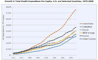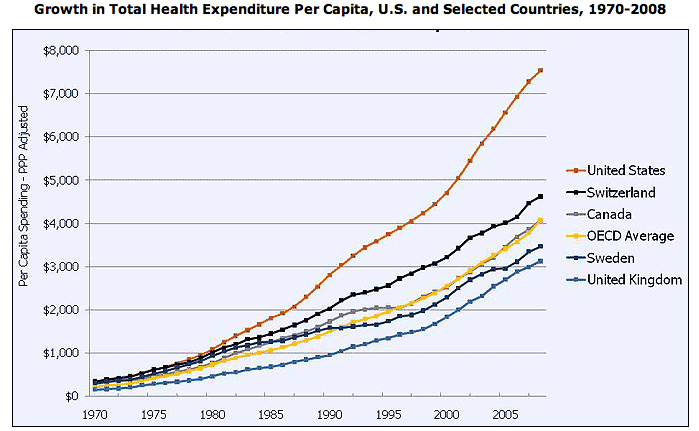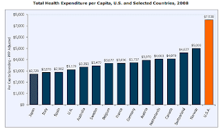 Here is a graph showing the per capita spending on health care for a variety of advanced economies showing how much of an "outlier" the United States really is: