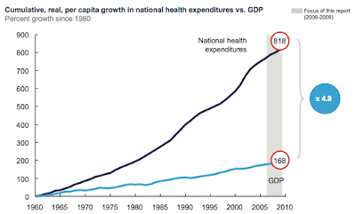When adjusted for inflation, cumulative real per capita spending on health care has grown by 4.9 times as much as GDP since 1960 as shown on this graph: