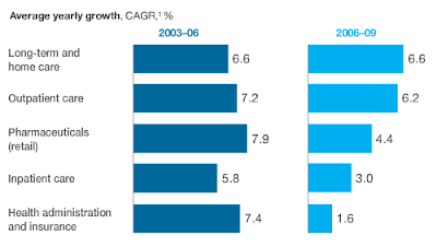 While the Great Recession did slow down the growth rate in spending on health care, certain categories saw very small reductions in spending growth, particularly long-term and home care and outpatient care as shown on this graph: