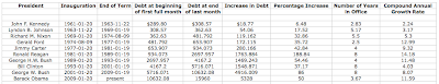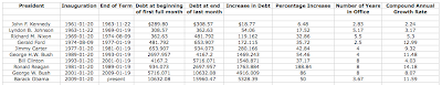 Here's the chart showing the Presidents in chronological order with the debt at the beginning of each President's term, the debt at the end of the term, the amount in nominal dollars by which the debt grew, the total percentage that debt grew over the President's full term and the length of the President's term (in years and months expressed as a decimal):