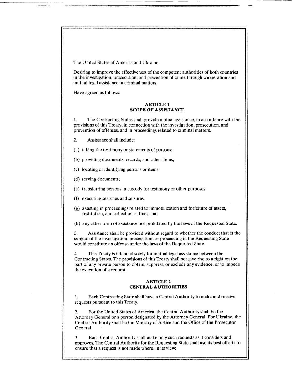 The Treaty covers mutual legal assistance in criminal matters. In recent years, similar bilateral treaties have entered into force with a number of other countries. The Treaty with Ukraine contains all essential provisions sought by the United States. It will enhance our ability to investigate and prosecute a range of offenses. The Treaty is designed to be self-executing and will not require new legislation." (my bold)