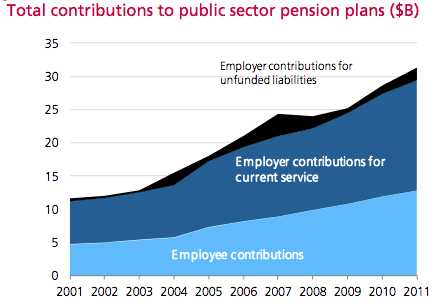 Way back in 2001, an average of $5,754 (in 2011 dollars) was being set aside for the pension of an average public servant; by 2011, this had risen to $9,976 annually, a 73 percent increase.