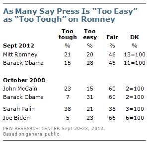 If we look back at the 2008 election, 23 percent of all voters surveyed thought that the press was too tough on John McCain compared to only 15 percent who thought that the press was being too easy. In 2008, only 7 percent of all voters surveyed thought that the press was too tough on candidate Obama and 31 percent thought that the press was too easy.