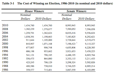 The average cost of winning a seat in the House rose by 101 percent from $715,401 in the 1986 election to $1,434,760 in 2010 when adjusted for inflation. The cost to win a seat in the Senate rose by 47 percent from $6,103,099 in 1986 to $8,993,945 in 2010, again, in inflation-adjusted dollars. Notice that the cost of winning a Senate seat actually peaked at $9,556,624 in 2006, a rise of 57 percent over 20 years. As well, you'll notice the jump from $6.228 million in 1998 to $9.115 million in 2000; that year's data is skewed by the spending of Jon Corzine of New Jersey who spent $63,209,506 and Hillary Clinton who spent $29,941,194, respectively spending 1334 percent and 632 percent of the average. Apparently, they really wanted to win!