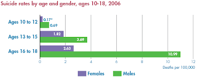 The American Academy of Child and Adolescent Psychiatry states that, at any given point in time, one in ten children and adolescents are affected by serious emotional disturbances that can lead to full-blown depression. Between 20 and 30 percent of adolescents have one major depressive episode before they reach adulthood. These episodes often lead to thoughts of suicide or actual suicide attempts. As shown on this graph, the incidence of suicides rises with age with suicide death rates for males aged 16 to 18 being by far the most prevalent:
