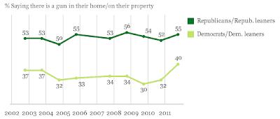 Historically, the gap between the percentage of Republicans and Democrats who own guns has varied between 16 and 24 percent, however, the 2011 poll showed a dramatic narrowing from the 20 percent in 2010 as gun ownership by Democrats rose by 8 percentage points or 25 percent. In the history of the survey, this level of gun ownership by Democrats was unprecedented.